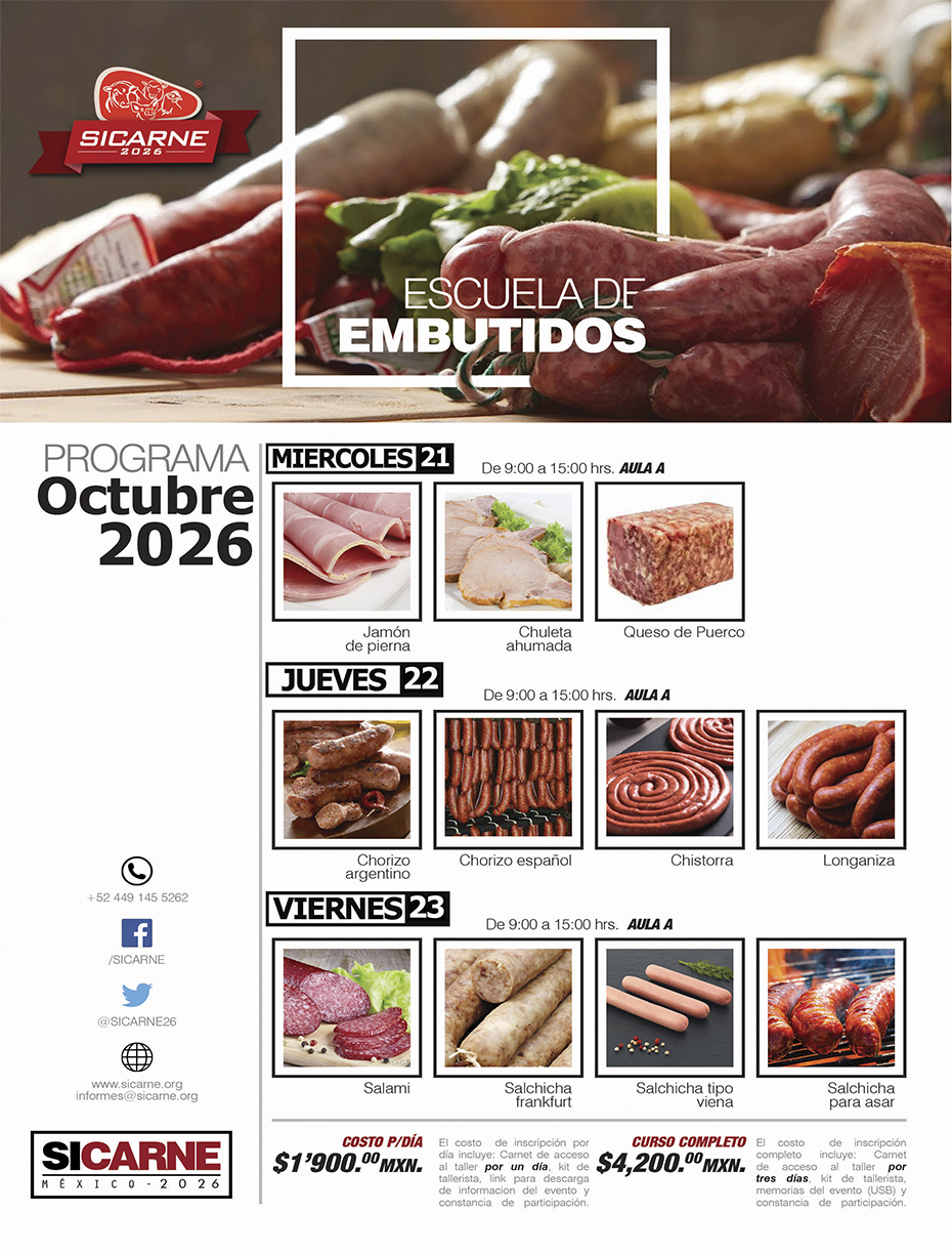 Talleres 100% prácticos con la elaboración de distintos embutidos con carne de cerdo, (chorizos, jamones, tocinos,salchichas, etc.); impartidos por especialistas en el ramo, reconocidos a nivel nacional e internacional. En esta edición de Pork Expo se suma al proyecto Sicarne a fin de diferenciar los procesos industrial vs tradicional en el taller en carne de Cerdo con elaboración de jamón, salami, tocino, chorizo español, verde, argentino chistorra,butifarra, salchicha para asar, salchicha desayuno, frankfurt, chuleta ahumada, queso de puerco, tocino, entre otros. Asiste y conoce los procedimientos para su elaboración.
